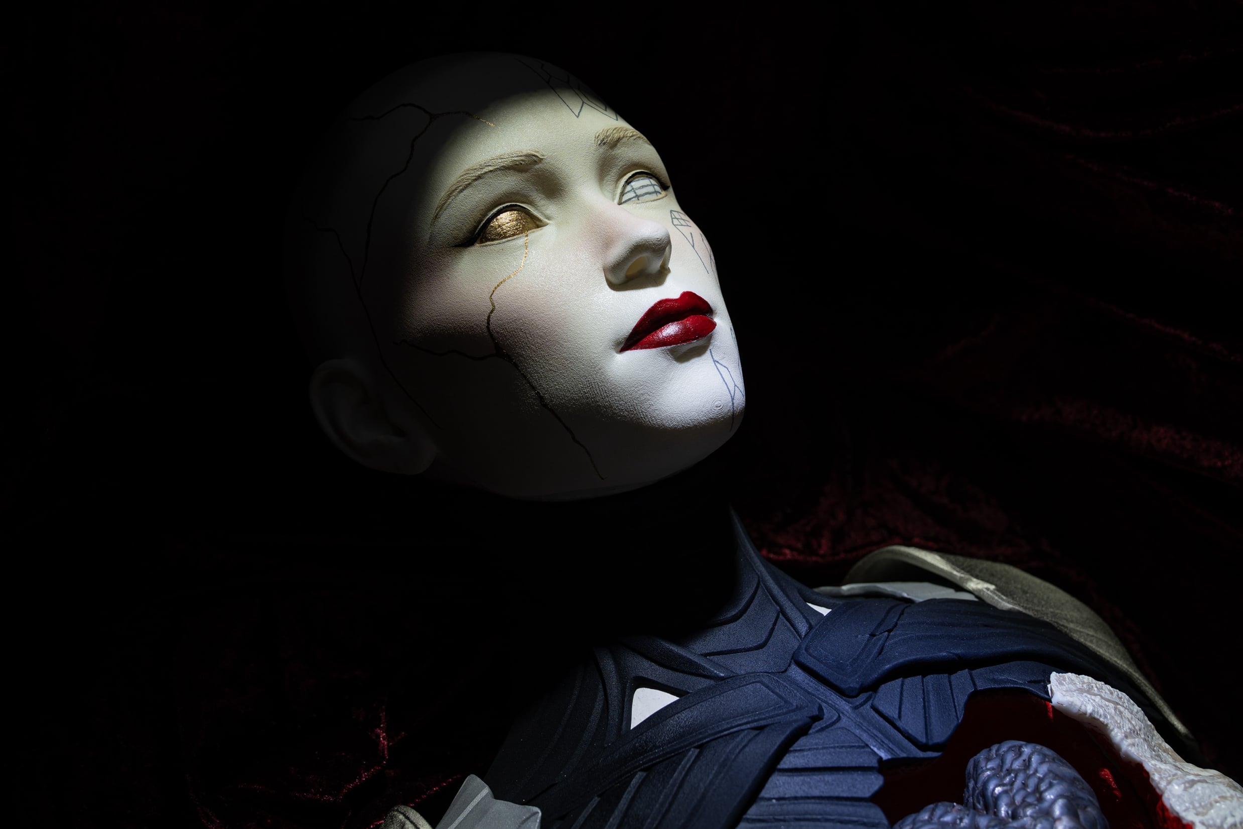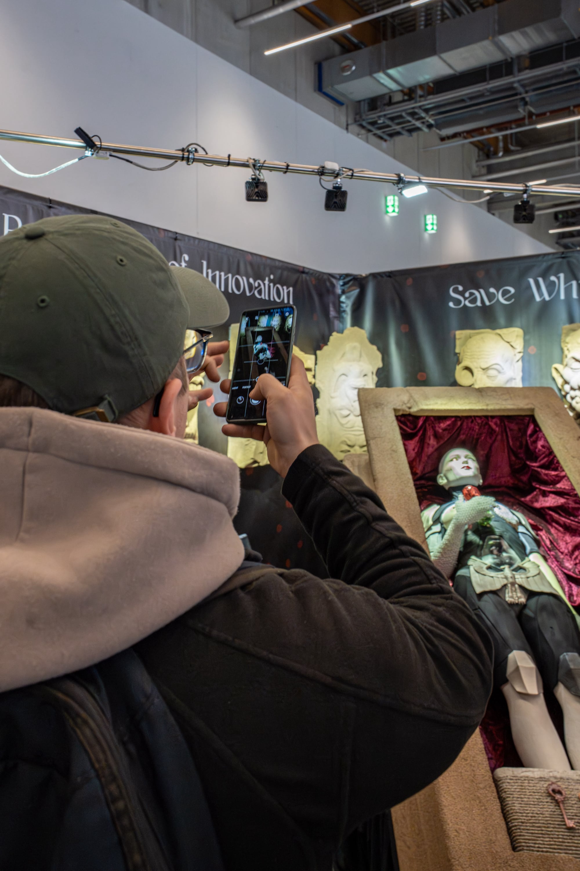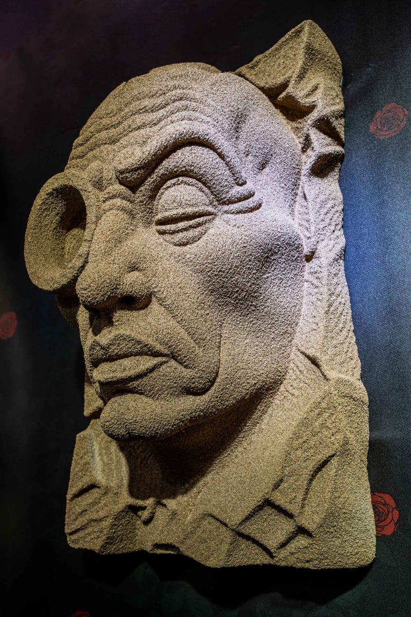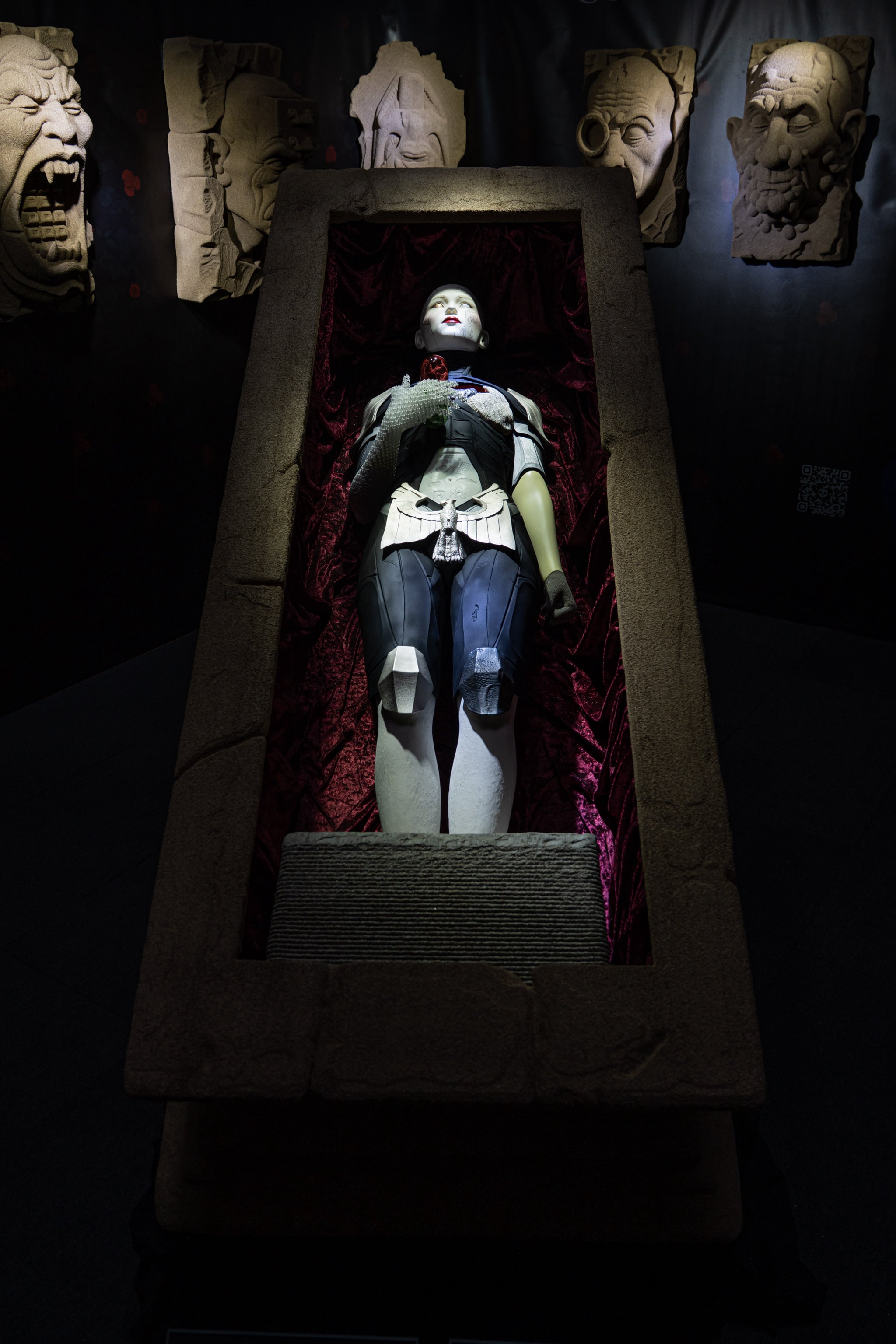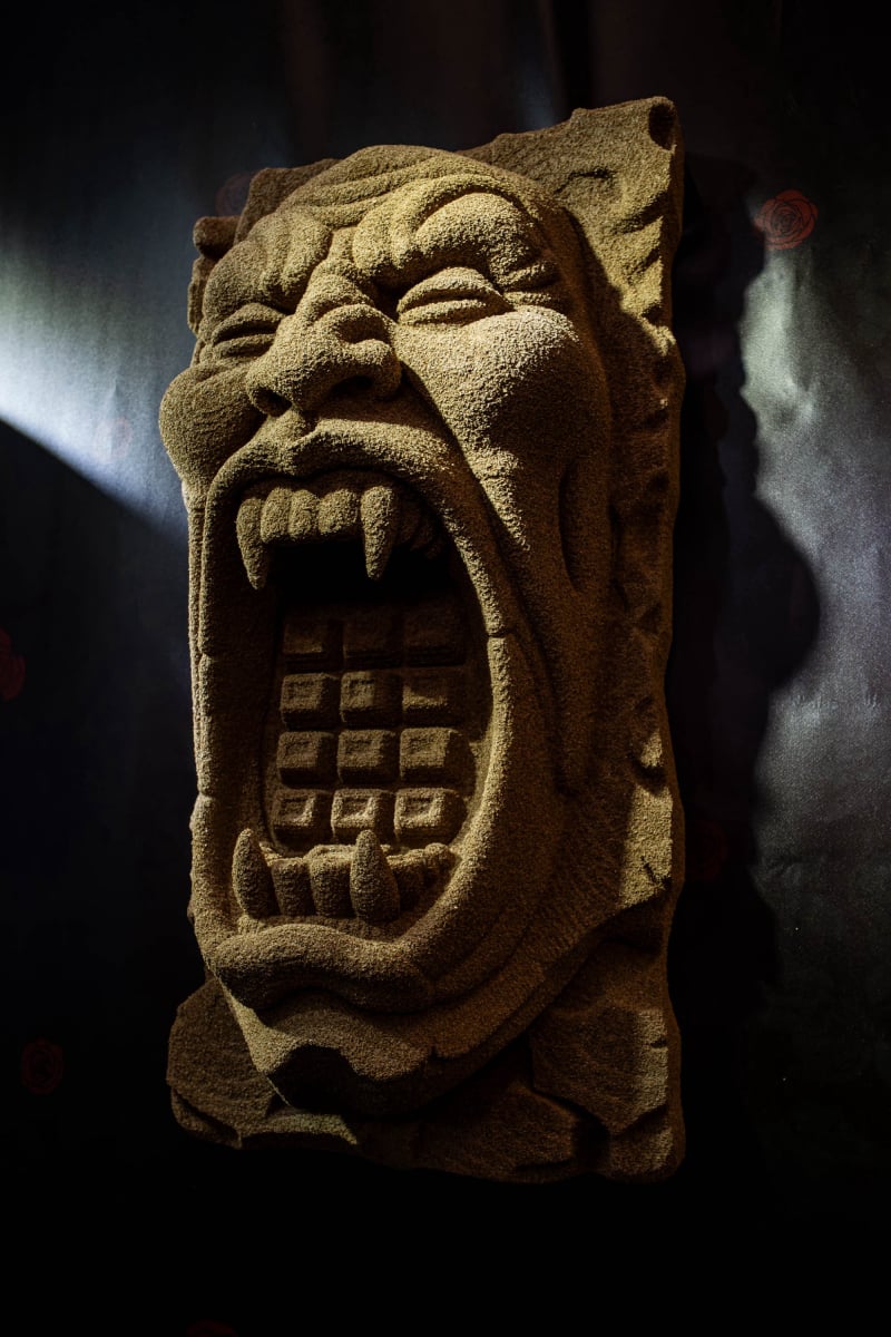 The figure, the chimeras, and the plaques automatically create attention and a short moment of cognitive pause. That is the purpose.